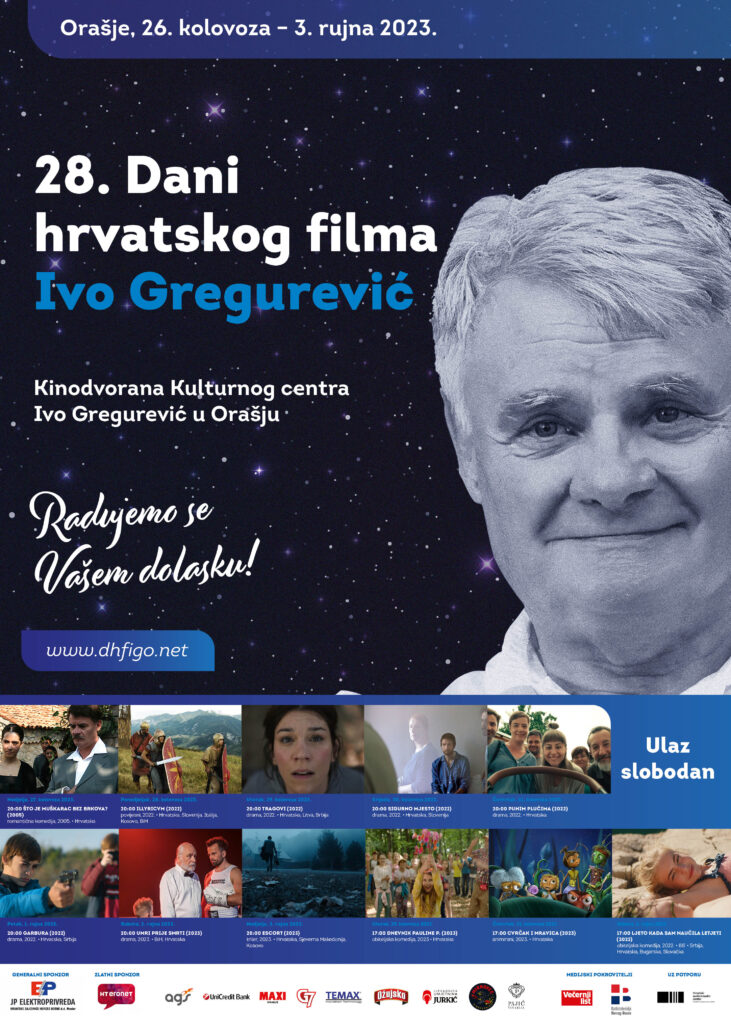 28. Dani hrvatskog filma Ivo Gregurević Orašje održat će se od 26. kolovoza do 3. rujna 2023. Svečana akademija i otvorenje Festivala održat će se u subotu, 26. kolovoza u 20 sati u ŠRC Bazeni Orašje. Filmski program počinje u nedjelju 27. kolovoza u 20 sati projekcijom hrvatskog filma Čaruga redatelja Rajka Grlića. Program se nastavlja recentnom hrvatskom produkcijom, te će u istom terminu biti prikazani filmovi Illyricvm, Tragovi, Sigurno mjesto, Punim plućima, Garbura, Umri prije smrti i Escort. U dječjem programu koji počinje 29. kolovoza u 17 sati biti će prikazani filmovi…